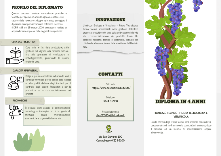 Il nuovo istituto tecnico, viticoltura ed enologia, ha lo scopo di formare tecnici specializzati nella gestione dell'intero processo produttivo del vino, dalla coltivazione della vite alla commercializzazione del prodotto finale. Inoltre rappresenta un modo per valorizzare il territorio